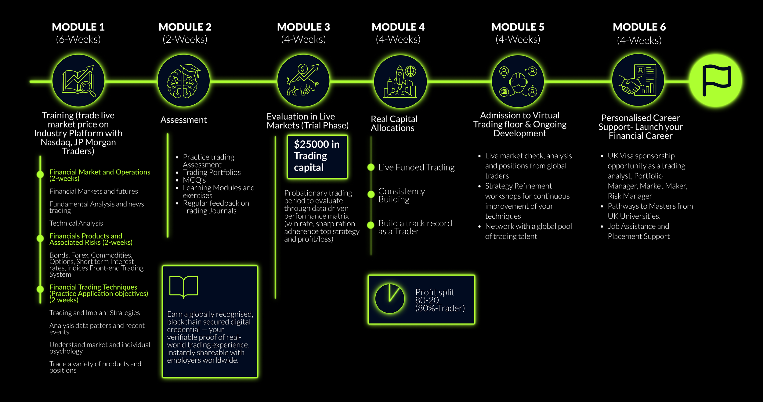 Every learner progresses into a structured 6-month trading internship, designed to replicate junior trader programmes followed by UK prop firms.